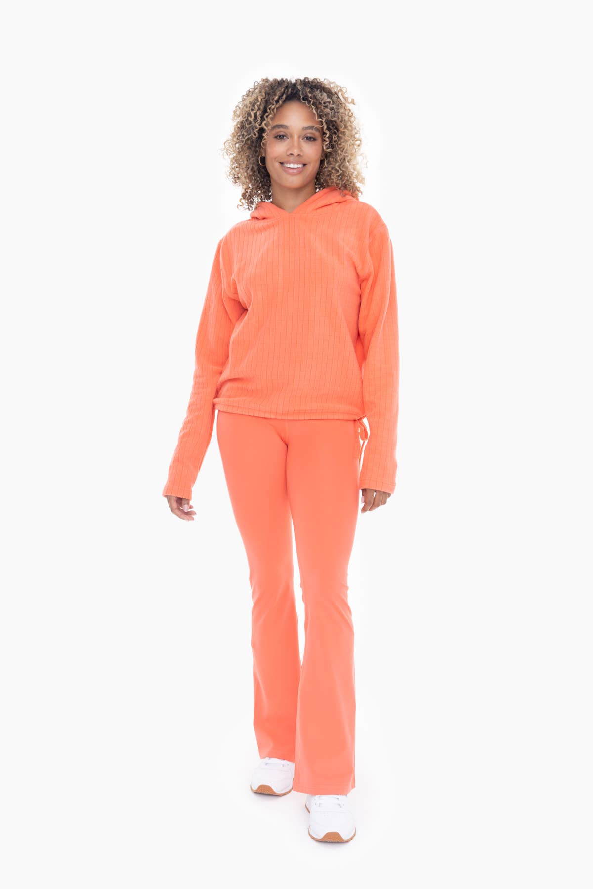 This hoodie features mid-weight burnout fleece with a subtle vertical stripe pattern, offering 4-way stretch and a brushed inner for comfort. The easy pullover silhouette is enhanced with an adjustable side tie at the hem, allowing you to wear it snug or loose, making it a versatile addition to your wardrobe.