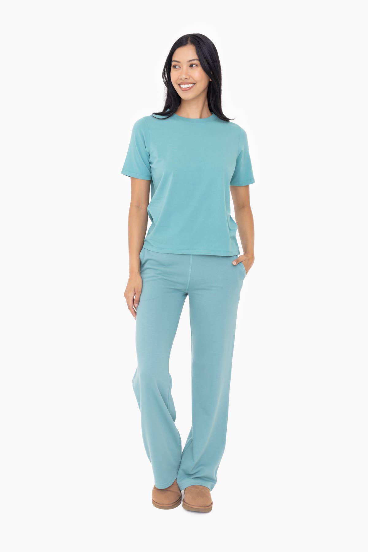 With the perfect balance of comfort and style, these straight leg stretch French Terry sweatpants are a lounge essential. They feature a ribbed waistband for extra hold, an adjustable drawcord, and hand pockets.