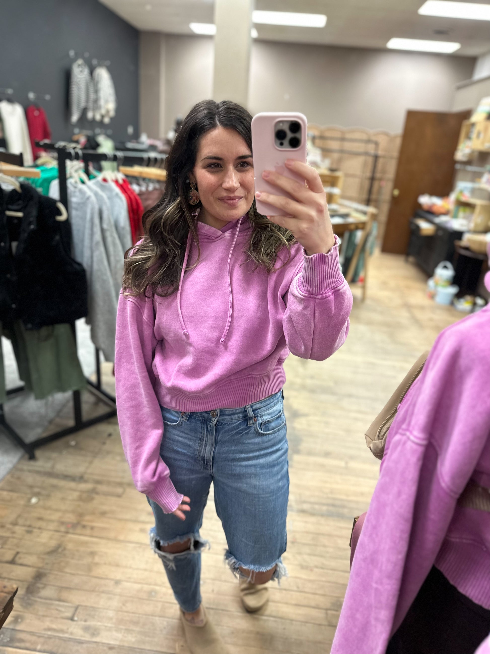 Acid washed fun bold purple pink cropped sweatshirt, lightweight it’s perfect for layering and will make a great transitional piece. Fun paired with flared leggings or a simple pair of denim.